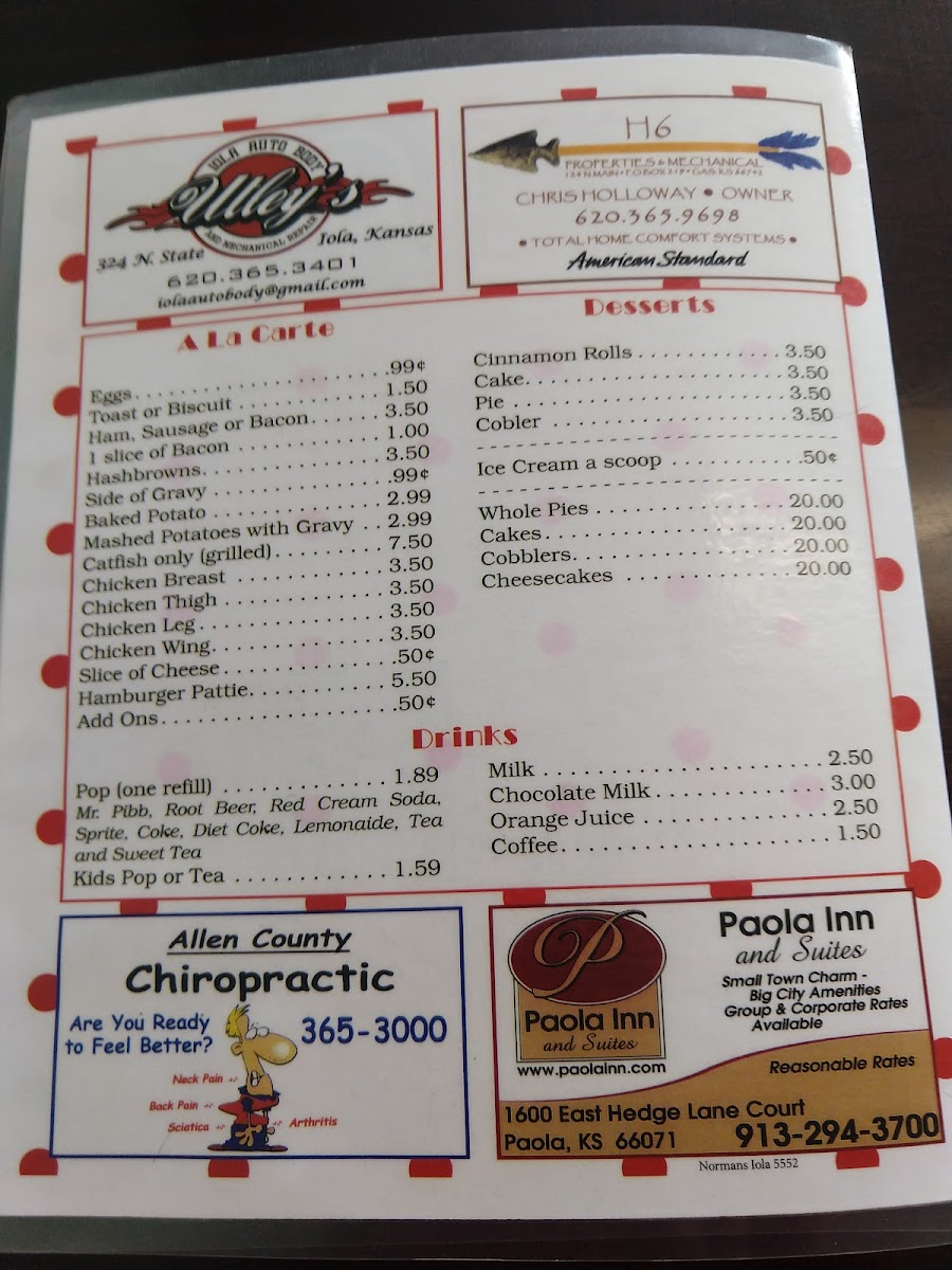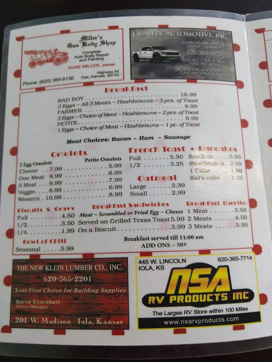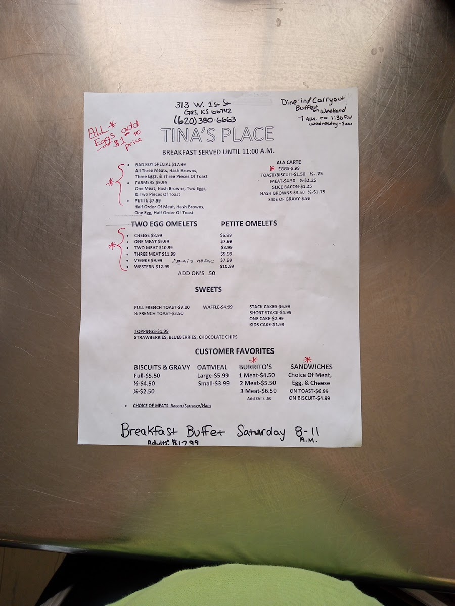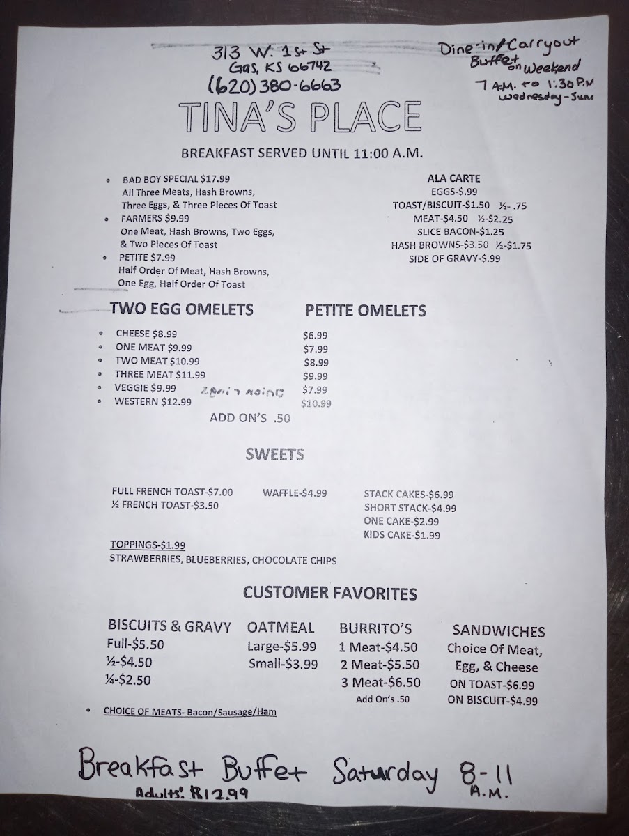 Welcome to Tina's Place, a hidden gem located at 313 W 1st St, Gas, KS. This charming eatery embraces home-style cooking, offering a menu that blends comfort and quality. Start your day with their delicious Two Egg Omelets, which range from classic cheese to hearty three-meat options. You can also enjoy ala carte selections like crispy Hash Browns and savory Bacon.